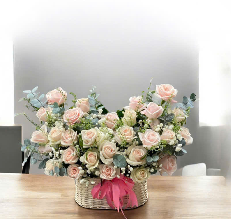 Giỏ mây trắng cao cấp: Giỏ hoa được cắm trong giỏ mây đan thủ công màu trắng tinh khôi, kết hợp cùng chiếc nơ lụa màu hồng đậm tạo điểm nhấn rạng rỡ và bắt mắt.