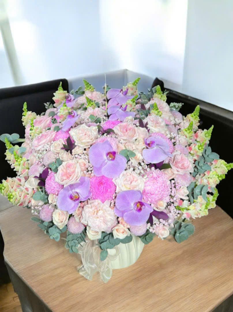 Giỏ Hoa Lan Hồ Điệp Phối Hồng Kem & Cúc Mẫu Đơn
