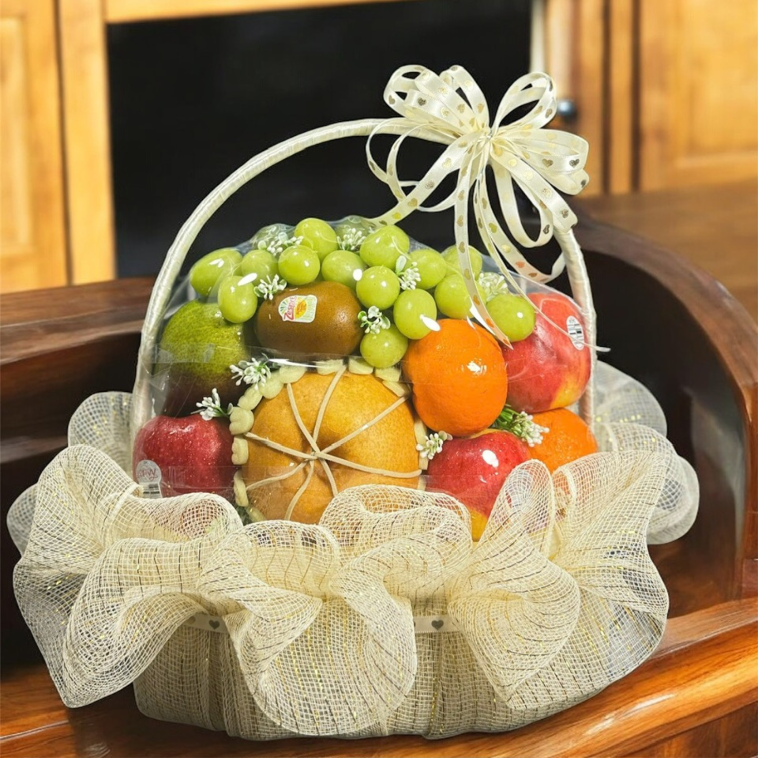 Trái cây tuyển chọn loại 1: Tâm điểm của giỏ là những quả Lê Hàn Quốc size lớn, Kiwi Zespri giàu dinh dưỡng cùng những chùm Nho xanh không hạt mọng nước. Tất cả đều được nhập khẩu chính ngạch, đảm bảo độ tươi ngon nhất thị trường.