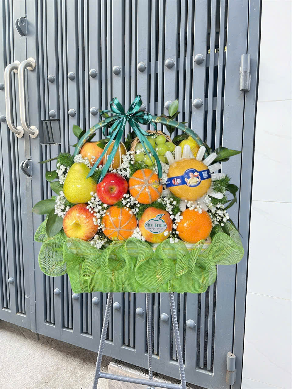 Hình thức bắt mắt: Sự phối hợp màu sắc giữa đỏ (hoa/táo), xanh (nho) và vàng (cam/lê) tạo sức hút thị giác mạnh mẽ, phù hợp trưng bày tại các buổi lễ.