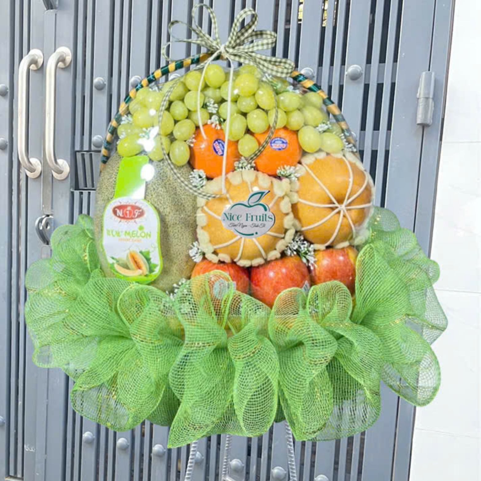 Lưới voan xanh lá: Bao quanh phần thân giỏ quả, làm nổi bật tông màu xanh đặc trưng của thiết kế mẫu 13.