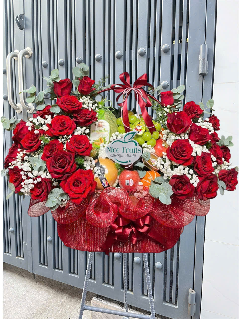 Hoa hồng đỏ: Sử dụng số lượng lớn hoa hồng đỏ tươi (khoảng 15-20 bông), cắm đối xứng hai bên giỏ quả để tạo điểm nhấn thị giác mạnh mẽ.