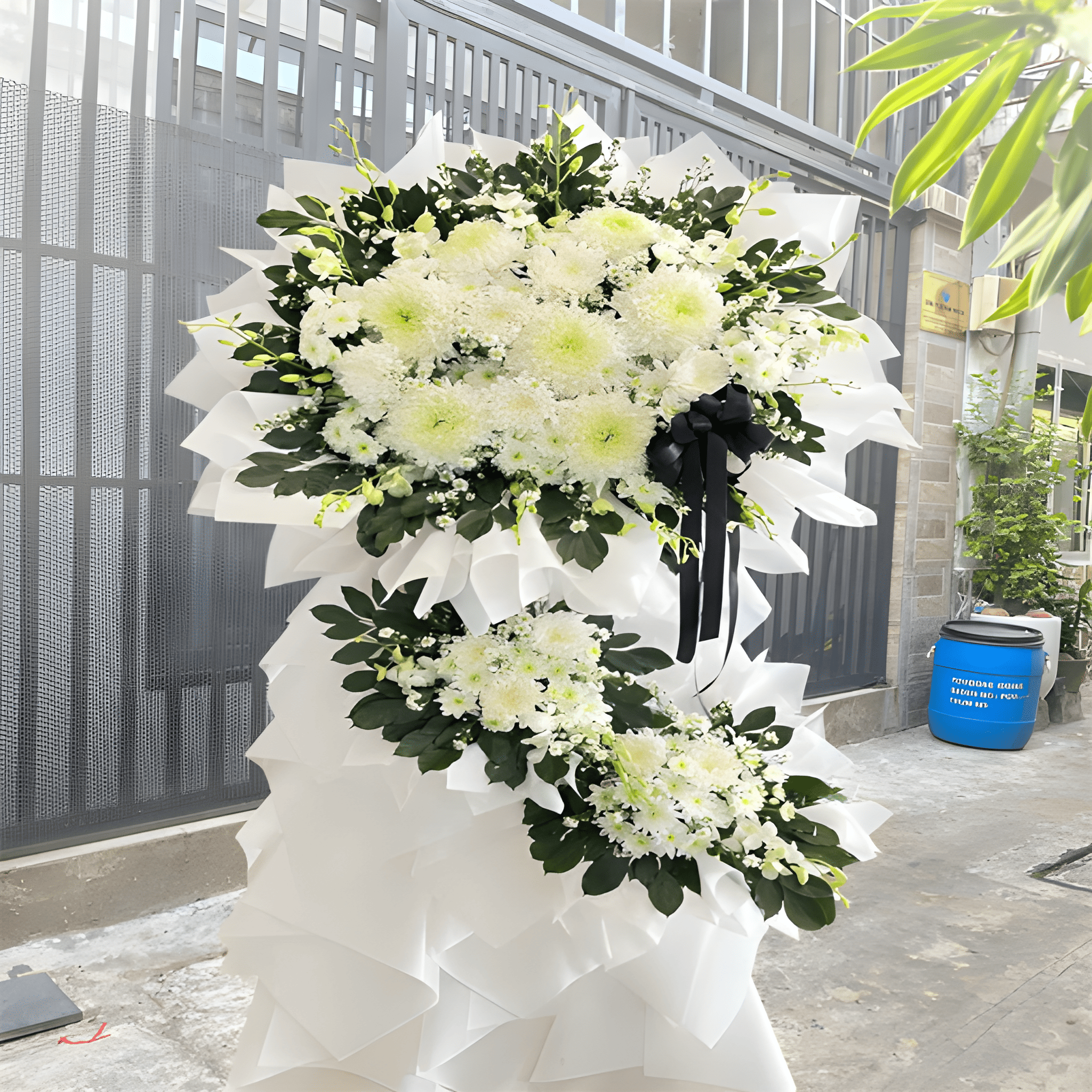 Trong những thời khắc đau buồn nhất của kiếp người, một kệ hoa chia buồn không chỉ là món quà vật chất mà còn là biểu tượng của sự an ủi và tấm lòng thành kính. Sắc trắng tinh khôi của hoa cúc và hoa lan đại diện cho sự thanh cao, tâm hồn thuần khiết và hy vọng về một sự khởi đầu mới ở thế giới bên kia.