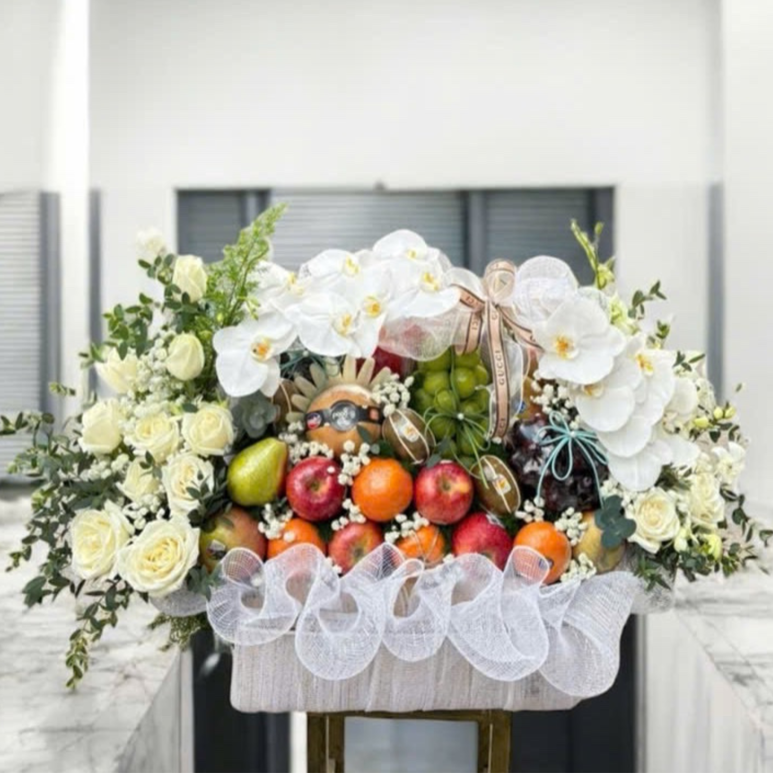 Phụ kiện đi kèm: Giỏ mây chắc chắn bản rộng, nơ lụa màu kem dập chữ nổi, màng co bảo vệ và lưới voan trắng bọc chân đế lẵng quả.
