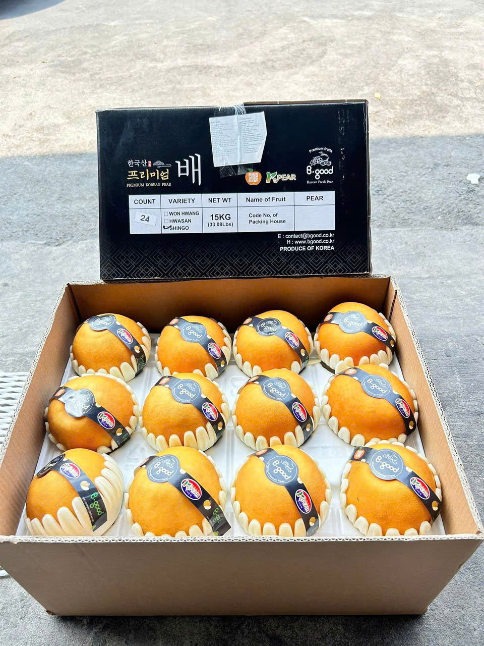 Quy cách đóng gói chuyên nghiệp: Từng quả lê được bao bọc cẩn thận trong lưới xốp bảo vệ trắng muốt và dán tem thương hiệu B-good chính hãng, đặt trong thùng giấy cao cấp trọng lượng 15KG (Size 24 quả/thùng).